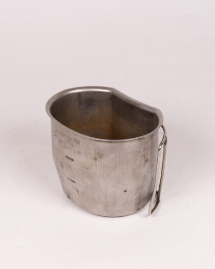 A used and worn, but very sturdy, 0.5 litre mess tin / billy can. Marked with the designation 'NSN 721-3131' along with the year '1996' and manufacturer 'RTNTS LTD'. This is the standard issue mess tin that would have been part of a set, but is now offered as a separate item. It is made from a durable metal, most likely stainless steel, and is designed to be used over a campfire or camping stove. There are two fold away handles on each side. A great item for camping, bushcraft, or military enthusiasts.