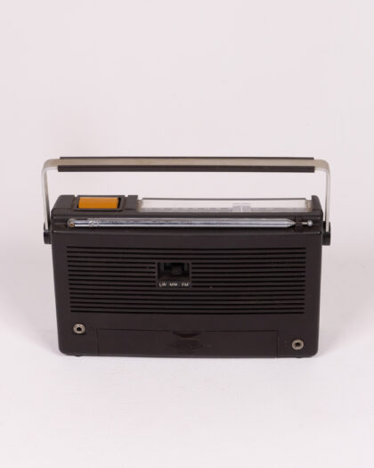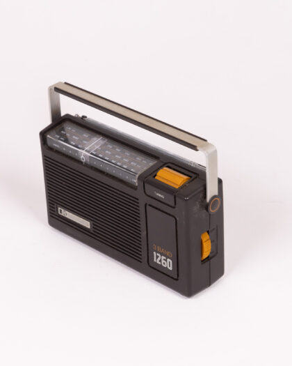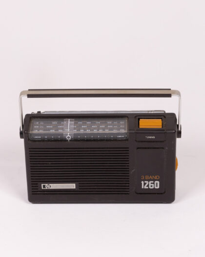 Vintage 3 Band 1260 radio. The radio features a black plastic casing with a silver metal handle. Tuning dial is orange with a small tuning display. The radio has a telescopic antenna, a speaker, and a power switch on the back. The radio shows signs of age with some dust and marks to the plastic casing. Ideal for a collector or someone who loves vintage electronics.