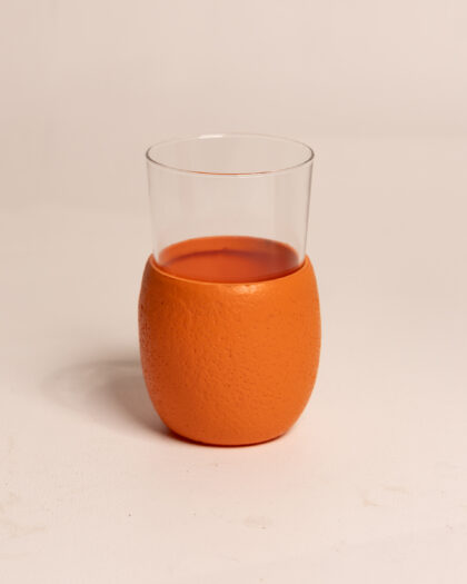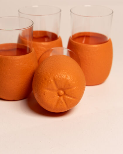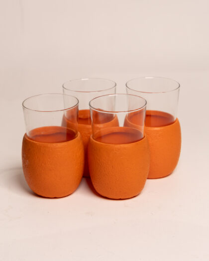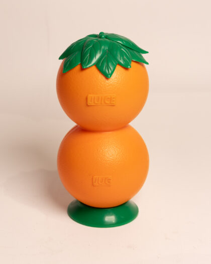 Vintage 70s double stacked oranges plastic pitcher, with four matching orange glasses.