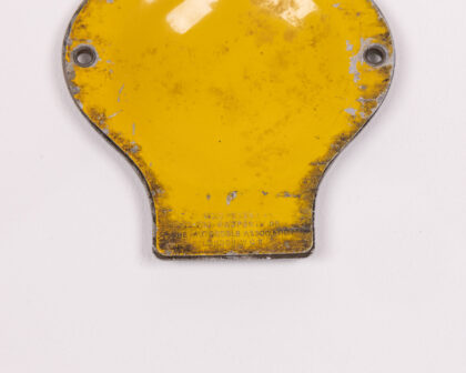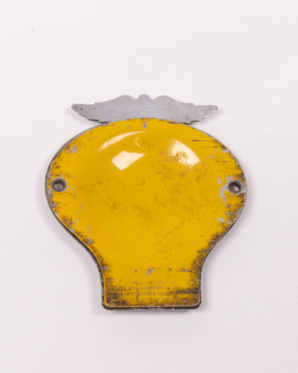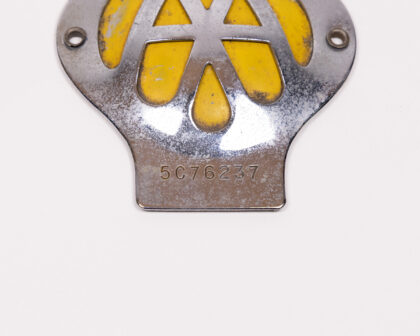 Vintage AA (Automobile Association) car badge. This metal badge features the distinctive AA logo in yellow and silver. The badge has an attached 'wings' top piece with a serial number on the lower portion of the badge. It shows signs of age and wear, with some pitting and discolouration to the metal and wear to the yellow paint, adding to its vintage charm. A perfect piece for collectors of automobilia or those looking to add a retro touch to their garage or home.