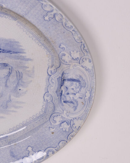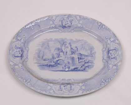 This is a decorative oval plate, likely dating back to the late 19th or early 20th century. The plate features a transfer-printed design in shades of blue, depicting a landscape with ruins, possibly of an abbey. The design is framed by an ornate border with cherubic figures and foliate motifs. The material appears to be ironstone ceramic. There is noticeable crazing throughout the glaze, which is typical for an item of this age and does not detract from its charm. Minor surface wear and small imperfections are present, consistent with age and use. Overall, the plate is in good condition, considering its age.