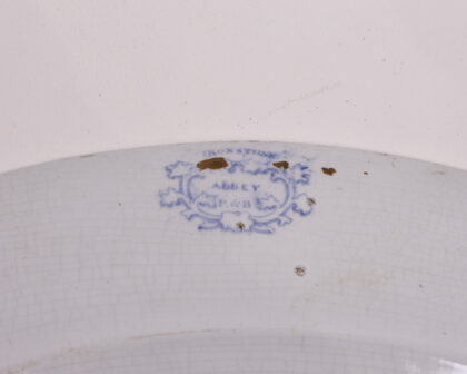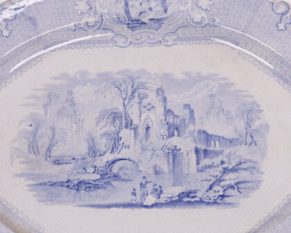 Antique ‘Abbey’ Ironstone Transferware Plate. Blue and white landscape scene with cherub details. Decorative vintage display piece.