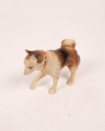 This is a vintage Action Man dog accessory, made of plastic. It features a brown and cream coat, with a distinctive red collar.