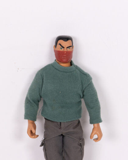 Vintage Action Man doll featuring a green knit top and grey cargo trousers. The doll has a red mask covering the lower half of its face. This vintage action figure is a nostalgic item that could appeal to collectors.