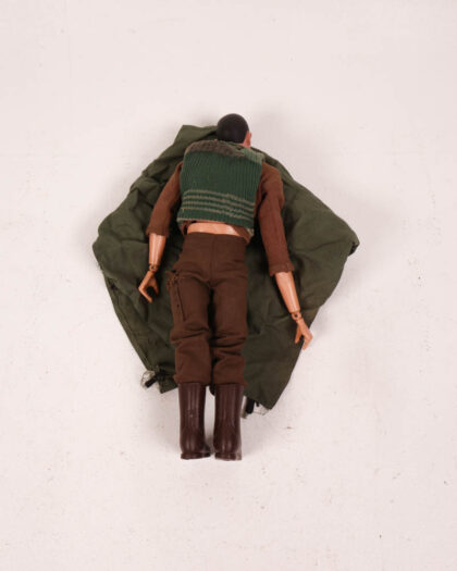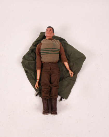 This is a vintage Action Man figure, a classic toy figure popular in the mid 20th century. This particular Action Man is wearing a brown uniform and boots. The uniform is complemented by a green bullet proof vest, and he comes with a matching green sleeping bag. The figure is in excellent condition considering its age. It is highly collectible and would display well in a vintage toy collection or a Man Cave.