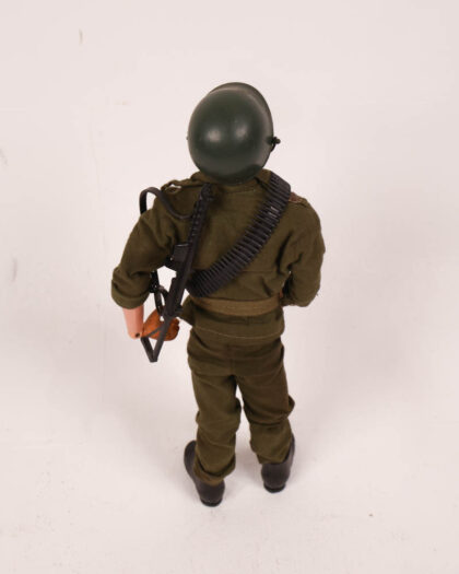 This is a vintage Action Man action figure, dressed in a military style olive green uniform. The figure features a fabric uniform, a black plastic belt with what appears to be ammunition, and a matching helmet. The figure displays jointed limbs for posing. There are signs of wear consistent with age, including minor marks and colour fading on the plastic components and the fabric, giving it an authentic vintage feel. This Action Man figure would be well-suited for display in a collection or as a nostalgic item in a man cave.
