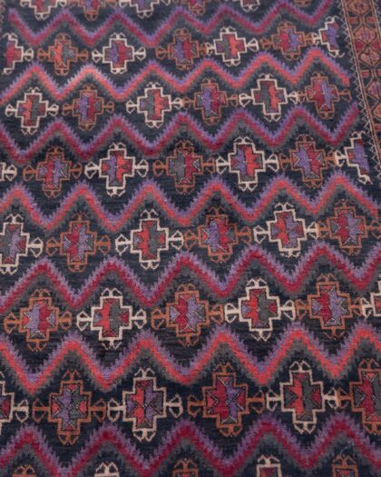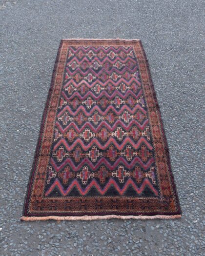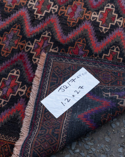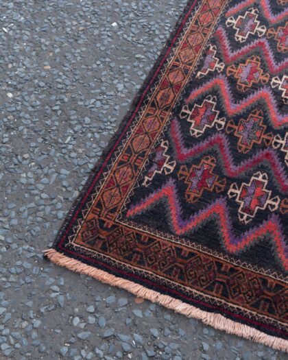This is a beautiful vintage Afghan rug with a striking geometric pattern. The colours are rich and warm, featuring black, red, and brown. The rug is made of a woven fabric and has a traditional design. This is a well-preserved item that would look great in a living room, bedroom, or home office. There is some minor wear consistent with age and use. See images for further details. This rug measures 1.2 x 2.7 meters.
