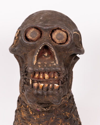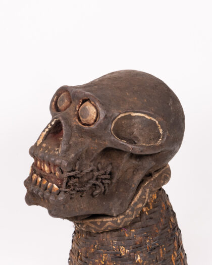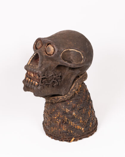 Authentic Ngui Gorilla secret society mask from Cameroon/Gabon. Carved wood skull with woven rattan base. Tribal art, excellent condition.