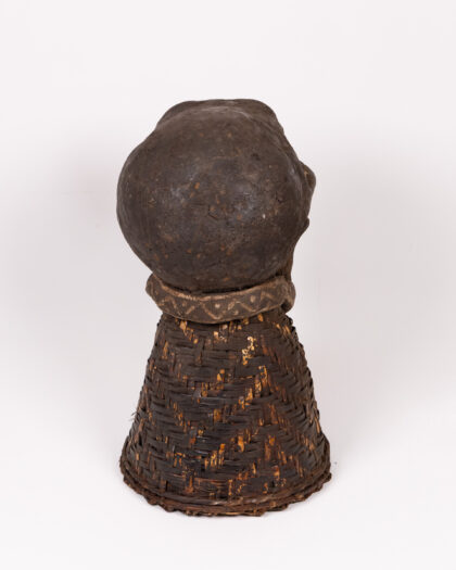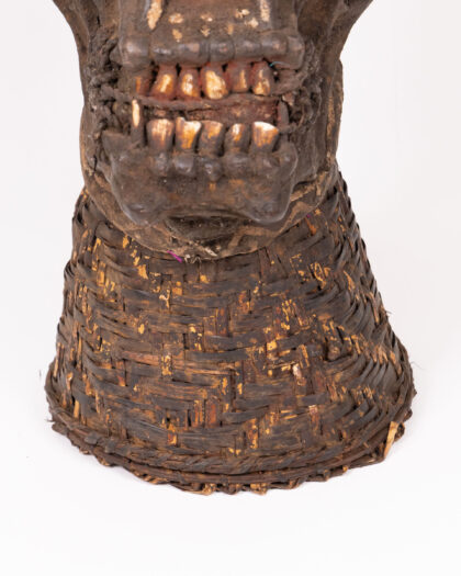 This is an authentic vintage cult mask of the Ngui Gorilla secret society, originating from the Boulu/Fang peoples in Cameroon and Gabon. The mask features a carved wooden skull with detailed features, including prominent eyes, a stylized nose, and visible teeth. The wooden elements have a rich, dark brown hue with reddish and gold accents. The mask sits atop a woven rattan base, providing a textural contrast to the smooth wood. The rattan is a darker brown, showing some signs of age and use. This mask would be a striking addition to a collection of tribal art or an intriguing decorative piece for a study or living room.