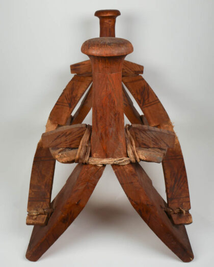 This vintage wooden North African Camel Saddle. tribal styling with its turned legs, carved geometric details and leather ties. The stool is constructed from dark stained wood. The top of the stool is formed by two intersecting wooden struts. The base of each leg features carved geometric decorations. The leather ties add a rustic touch and contribute to the stool's overall character. It displays wear from age and use. This would display well in a living room.