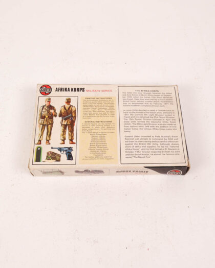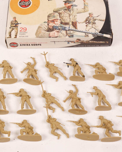 Vintage Airfix 'Afrika Korps' military series set with 29 plastic toy soldiers. Original box included. Box is worn but figures are in good condition.