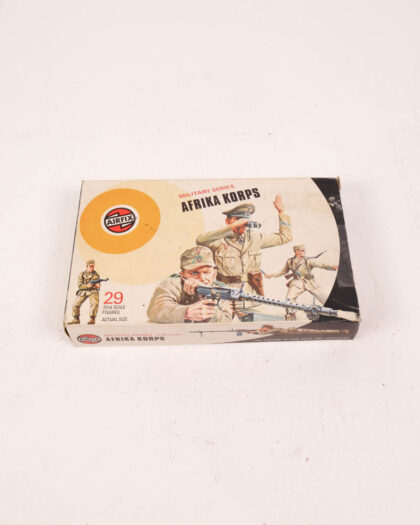 This is a vintage Airfix 'Afrika Korps' military series set featuring 29 unpainted plastic toy soldiers. The set includes a variety of poses and weaponry. The figures are in good condition. The original box is included, displaying the set's name, the Airfix logo, and images of painted figures. The box shows wear consistent with age and storage, including scuffs and creases. This would display well in a collection or man cave.