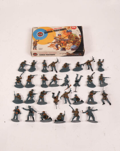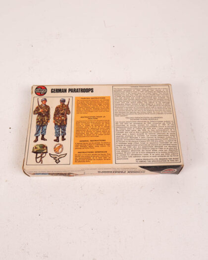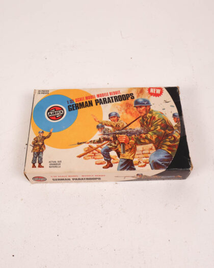 Vintage Airfix German Paratroops 1/32 scale model kit. Contains 39 plastic figures and original box. Box has some wear. Figures have some paint.