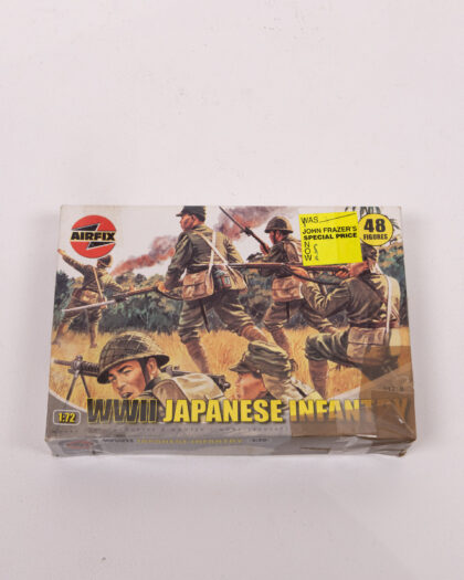 This is a vintage Airfix model kit of WWII Japanese Infantry in 1:72 scale. The kit includes figures and is unbuilt in its original box. The box has a price tag still attached from John Frazer's and is in good condition for its age. Would be a great addition to any military or model kit collection.