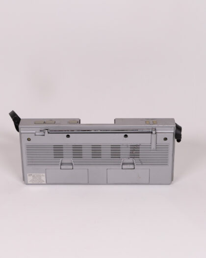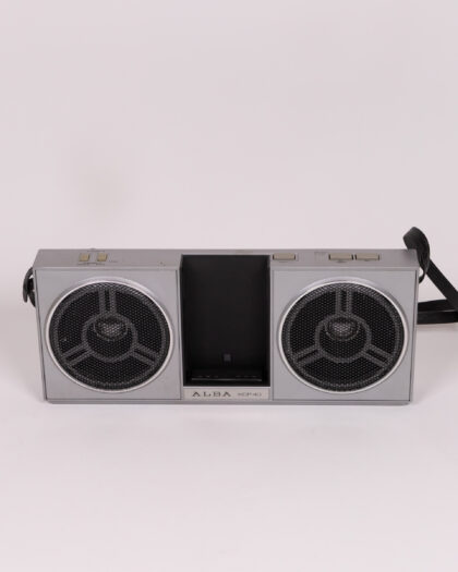 This is an Alba KCP40 portable stereo radio cassette player. The unit is silver and black, and has a carrying handle. The back has a serial number sticker. It has two speakers. Would make a great decor or nostalgia piece. This item is untested and sold as is.