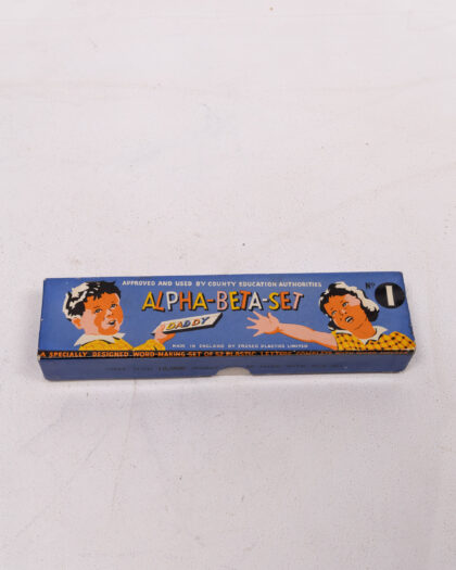A vintage Alpha-Beta Set, a word-making set for children. The box is blue and features graphics of children and lettering. It includes plastic letters in various colours and styles. The set is 'Approved and Used by County Education Authorities'. The condition is good, with some wear to the box commensurate with age. A nostalgic educational toy from a bygone era.