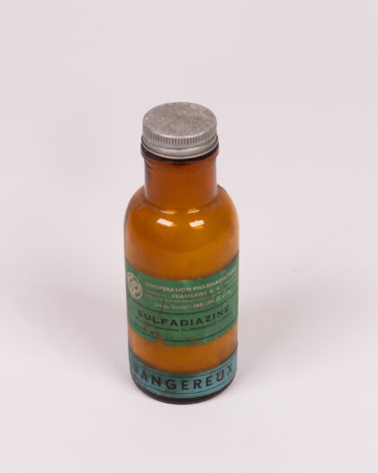 This is a vintage amber glass bottle that once contained Sulfadiazine. The bottle features a metal screw-top lid and a green and white label. The label has the words 'COOPERATION PHARMACEUTIQUE FRANCAISE S.A.' and 'SULFADIAZINE' along with the word 'DANGEREUX'. A great medical collectible.