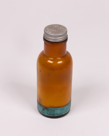 Vintage amber Sulfadiazine bottle with green and white labeling and metal cap. A great addition to any medical collection.