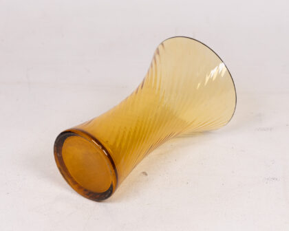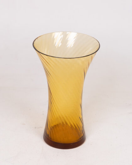 A vintage amber-coloured glass vase with a slightly twisted design. The vase is wider at the top and bottom, with a narrower middle section. The glass is smooth, with a clear, shiny finish. The colour is consistent throughout, with a deeper amber shade at the base that graduates to a lighter shade towards the top. The vase appears to be in good condition, without any obvious chips or cracks. Perfect for displaying flowers or as a stand-alone decorative item.