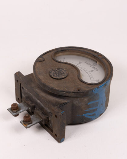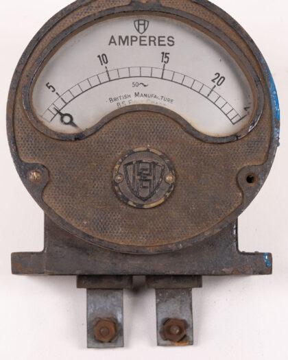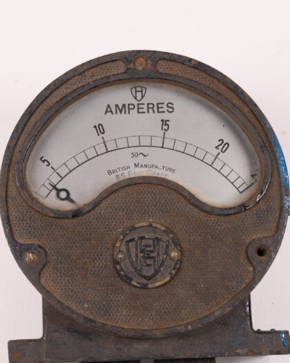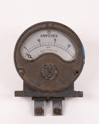 Vintage British-made ammeter with metal casing and clear dial. A unique industrial-era collectible, perfect for display. Shows signs of age.