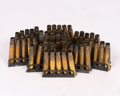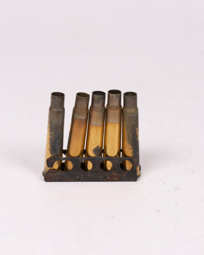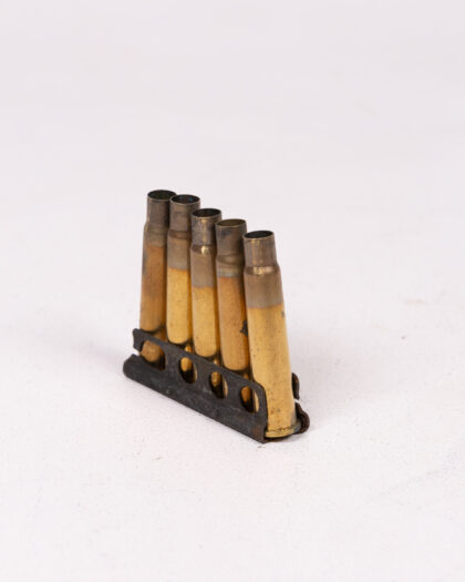 Vintage ammunition clip featuring brass casings and metal holders. These pieces offer a glimpse into military history. The casings show signs of age and use, with some tarnishing and wear on the brass. The metal clips exhibit a dark patina, adding to their authentic vintage appeal. Perfect for collectors of military memorabilia or those interested in historical artifacts. Each clip holds several rounds, showcasing the design and construction of the era.