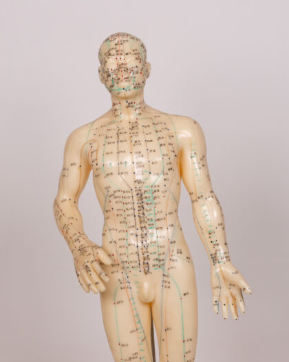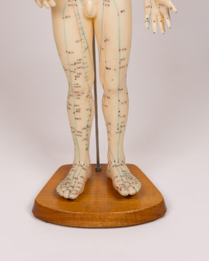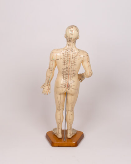 Detailed acupuncture model with acupressure points labelled in Chinese, mounted on a wooden base, for educational/decorative use.