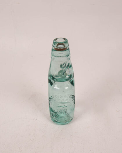 This is a vintage Andrew & Atkinson Codd bottle, a type of bottle designed to contain carbonated drinks. It is made of light green glass and features a distinctive design with a chamber in the neck to trap a marble and seal the bottle. The marble is held in place by the pressure of the carbonated liquid. The glass has some clouding inside from age. The shape is cylindrical, with a short, narrow neck. The bottle is embossed with markings on the lower section. This vintage bottle would look great displayed on a shelf or as part of a collection.