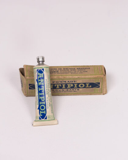 Vintage AntiPiol ointment tube with original box. Shows wear consistent with age. Medical collectible for display. French origin.