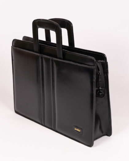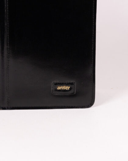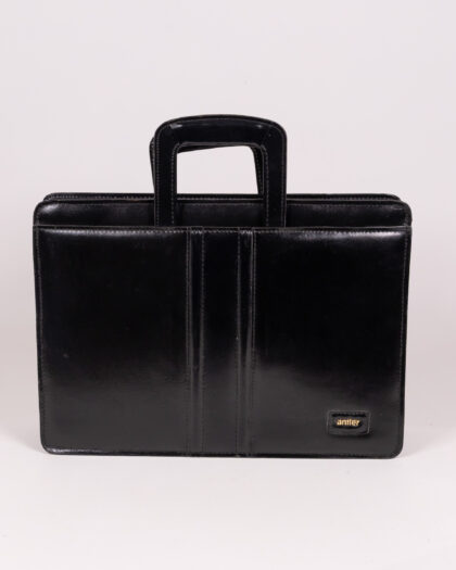 Discover this classic vintage Antler briefcase, crafted from elegant black leather. Featuring distinctive gold Antler branding and a robust central handle, this briefcase offers both style and practicality. It secures with a reliable zip closure, keeping your contents safe. Perfect for carrying documents to work, organizing your essentials for study, or simply as a sophisticated accessory for any outfit. Its timeless design makes it a versatile addition to your collection.