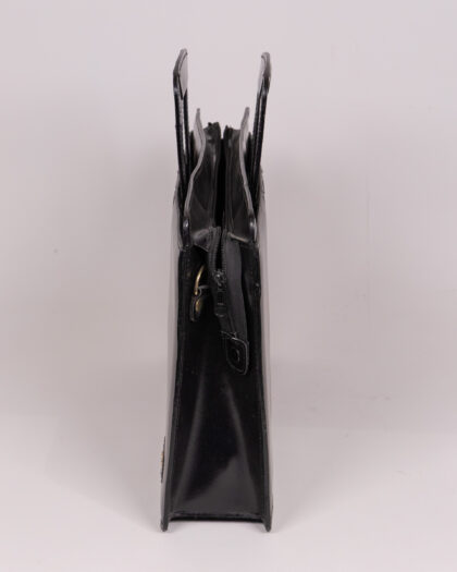 Stylish vintage Antler black leather briefcase with gold branding, central handle, and zip closure. Ideal for work, study, or as a sophisticated accessory.