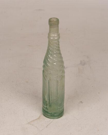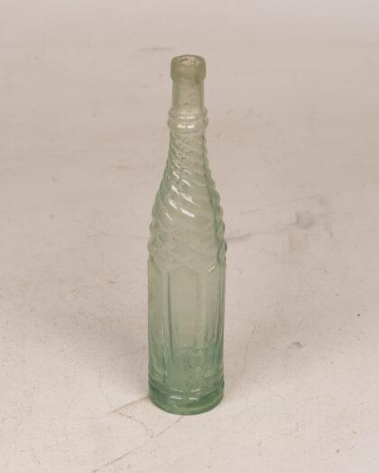 This is a vintage aqua glass bottle featuring a distinctive swirl design on the neck and body. The glass has a slightly cloudy appearance, consistent with age and use. There are some minor surface scratches visible upon close inspection. The bottle is intact and suitable for display or collectible purposes. Measures approximately 20cm tall. Ideal for collectors of vintage glass or those seeking unique decorative items. Condition is good, with minor wear appropriate for its age. This bottle has an appealing vintage aesthetic. The swirl design is particularly eye-catching and adds to its charm.
