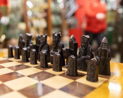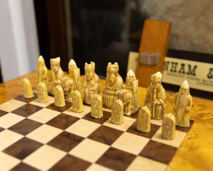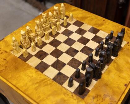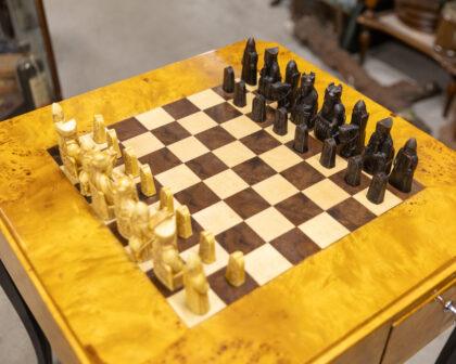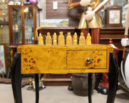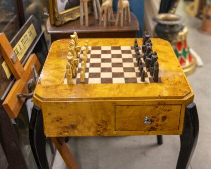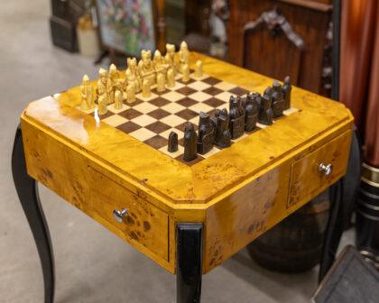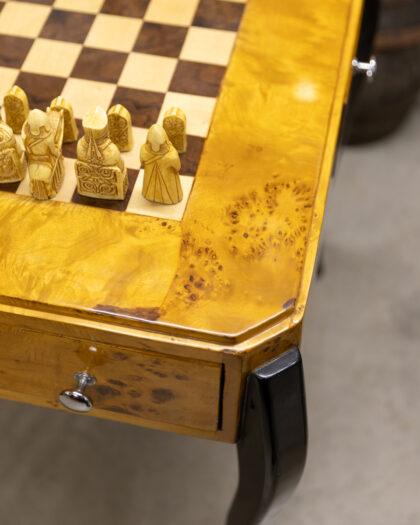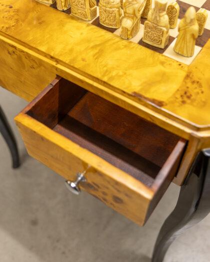 This exquisite Art Deco chess table features a beautifully crafted wooden board with a high-gloss finish. Supported by sleek black legs, the table includes convenient drawers for storing chess pieces, adding both style and functionality to any room.
