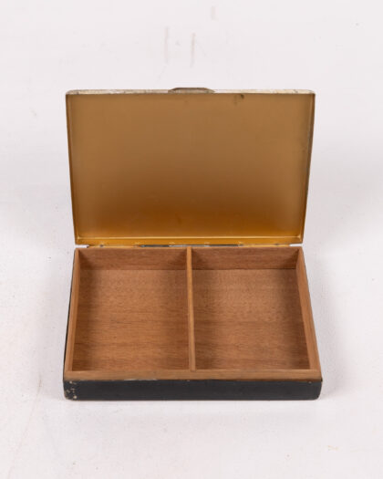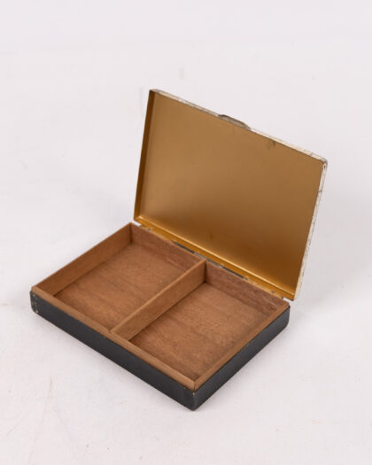 This is a vintage rectangular trinket box with a hinged lid and two compartments inside. The box is constructed from metal, and the exterior has been finished in black. The top features a silver Art Deco-inspired geometric pattern. The inside is lined in wood with a divider creating two separate compartments. There are areas of wear and tear commensurate with age, notably on the exterior of the box, where the black finish has chipped.