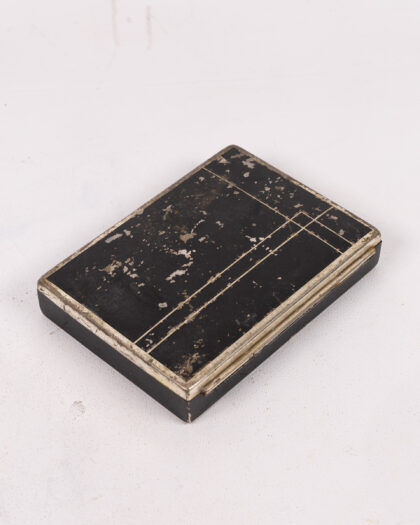 Vintage Art Deco trinket box. Black with silver geometric pattern and gold interior. Ideal for storing jewellery or small keepsakes.