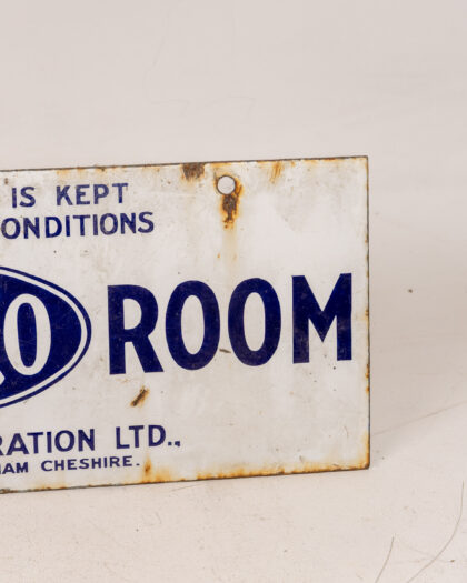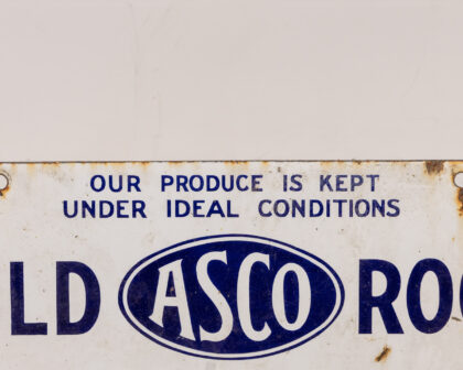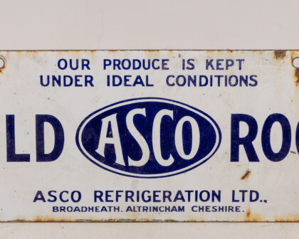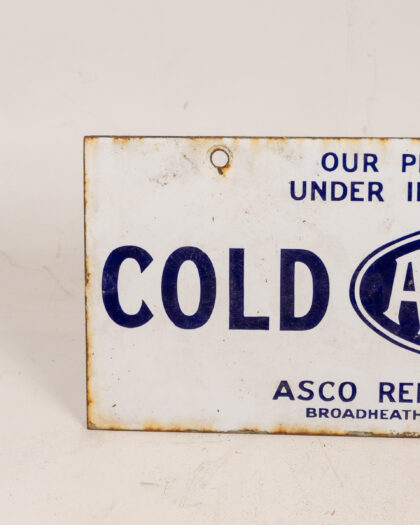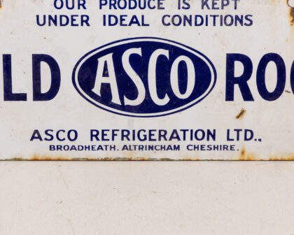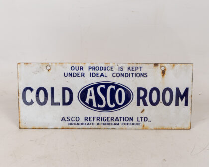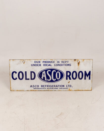 This is an original vintage enamel sign from ASCO Refrigeration Ltd., Broadheath, Altrincham Cheshire. The sign reads 'Our produce is kept under ideal conditions. Cold ASCO Room.' It features a white background with blue lettering. There are some signs of age and wear, including some chipping and rust around the edges and mounting holes. A piece of British industrial history. Perfect for collectors.