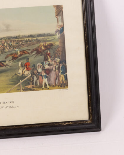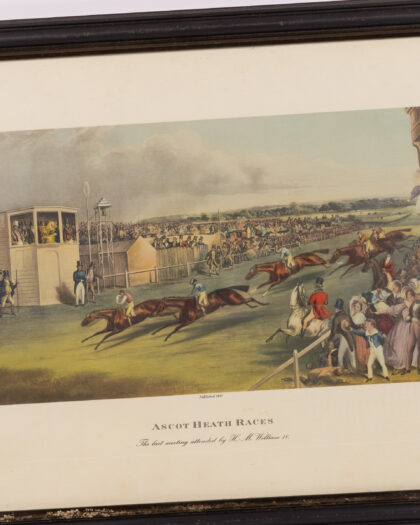 Vintage framed print of Ascot Heath Races, published in 1837, showing an active horse race and track.