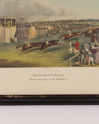 This is a framed print depicting Ascot Heath Races. The print itself is titled 'Ascot Heath Races, the last meeting attended by H.M. William IV, published 1837.' The image shows a horse race with spectators on the sidelines and in stands. The print is framed in a dark wooden frame. The frame shows signs of wear and age. The print itself is in good condition, with some minor foxing and age-related wear.