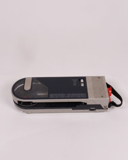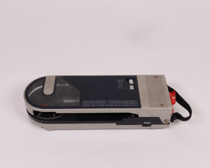 Vintage Audio-Technica Sound Burger AT727 Stereo Disc Player System. This portable record player has a grey and black exterior with red accents. It features power and speed controls. A unique and nostalgic piece of audio history.