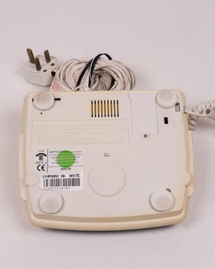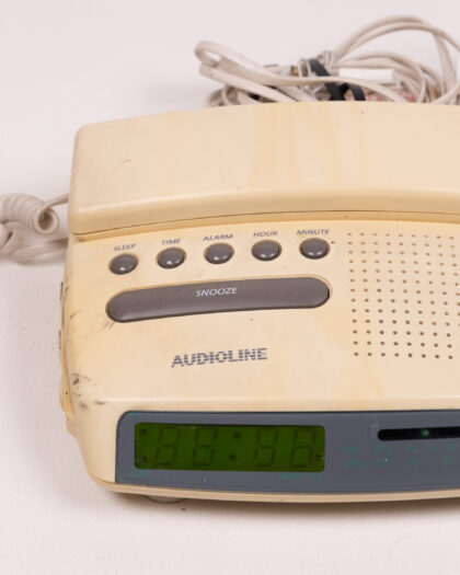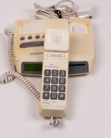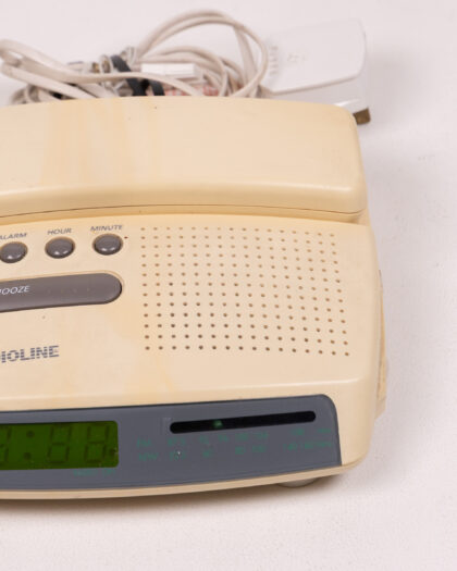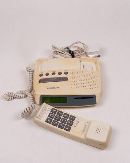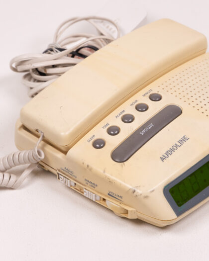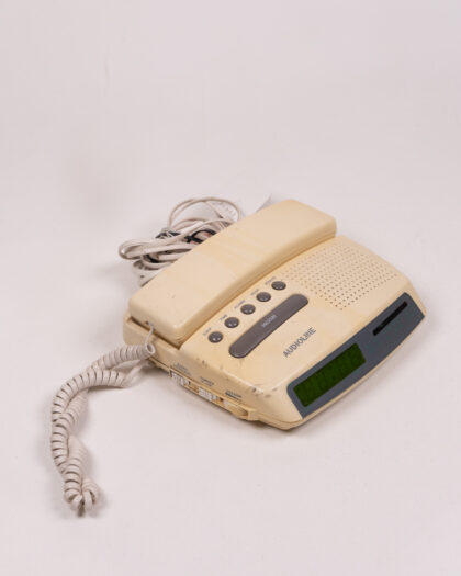 This Audioline telephone radio is a unique and nostalgic piece of technology. It combines a telephone with a radio, offering both communication and entertainment in one device. The cream-colored plastic body shows signs of age, with some discoloration and marks. The buttons are clearly labeled for easy use, and the digital display is bright. The handset is attached with a coiled cord. Overall, this vintage Audioline telephone radio is in used condition.
