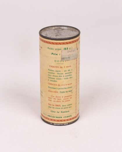 Vintage French AZYMIC Pet Powder Tin. Aromatic disinfectant powder, perfect for vintage pet care collectors. Signs of wear commensurate with age.
