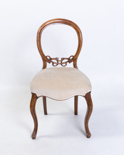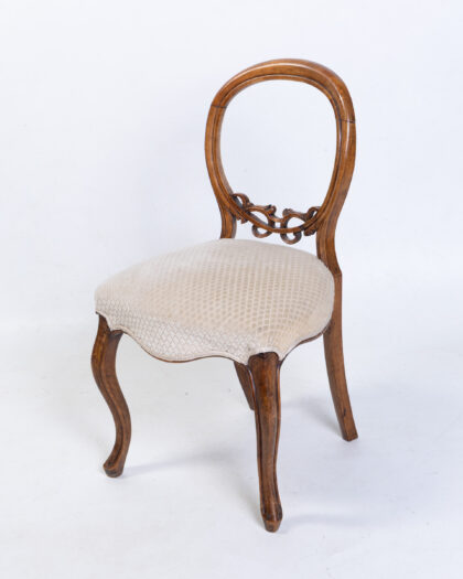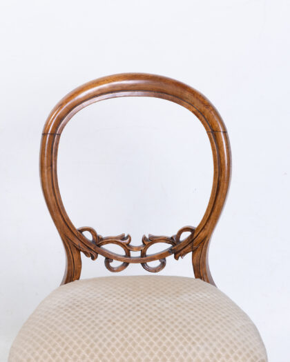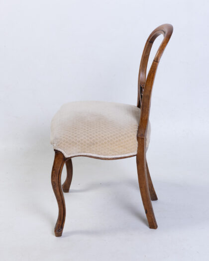 This is a vintage balloon-back chair featuring a curved, open back design. The frame is constructed from a warm-toned wood, possibly walnut or mahogany, and features subtle carved detailing at the base of the back support. The seat is upholstered in a patterned cream fabric. The chair legs are curved. There are some signs of wear to the wooden frame, consistent with its age, but is overall in very good condition.