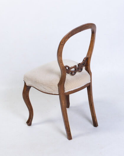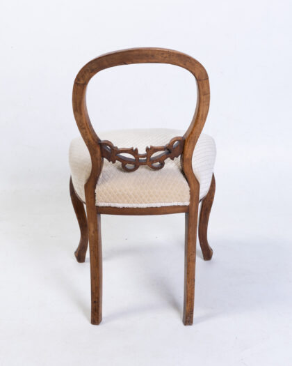 Elegant vintage balloon-back chair. Classic design with wood frame, cream fabric seat. Adds charm to any room. Good condition, signs of age.