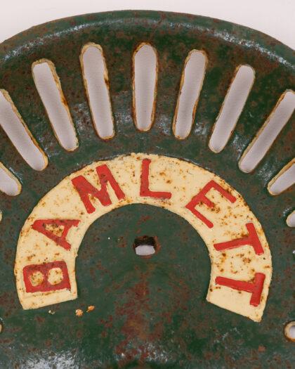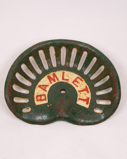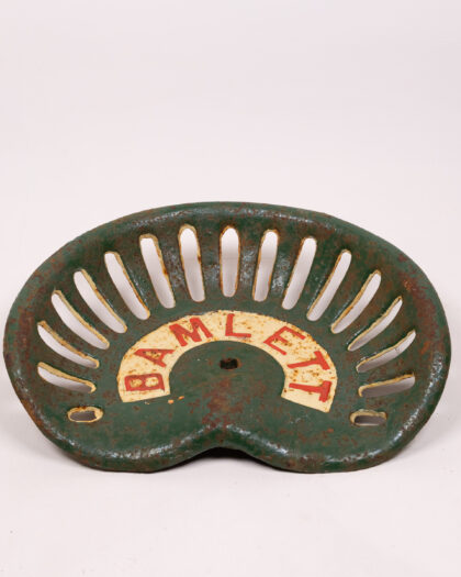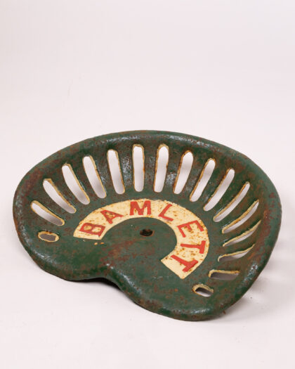 Vintage Bamlett tractor seat, made from cast iron. The seat is green and cream with 'Bamlett' printed in red letters. There is some surface rust, commensurate with age, but the seat is in overall good condition. This would make a great decorative item for the home or garden.
