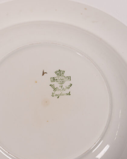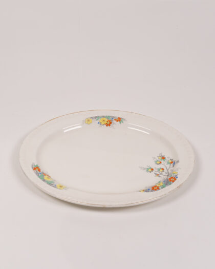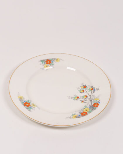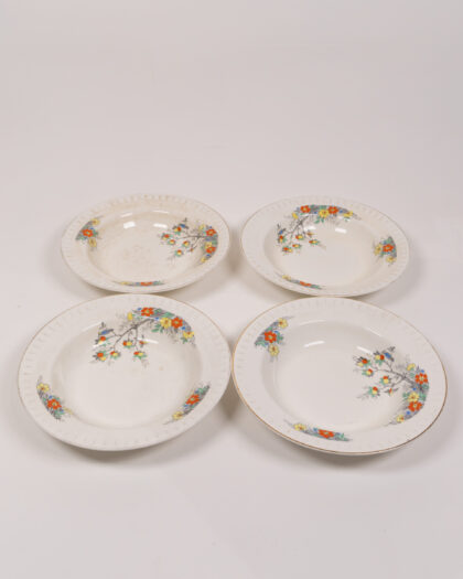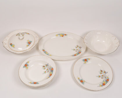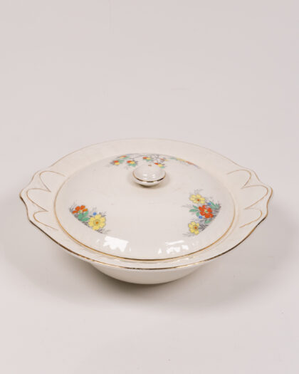 Discover this charming vintage Barratts of Staffordshire serving set, a delightful addition to any retro or traditional table setting. This comprehensive collection features a lidded tureen, a generous serving bowl, a classic platter, and four smaller plates, all crafted from cream ceramic. Each piece is adorned with a vibrant floral design and elegant gold trim, complemented by a distinctive scalloped edge on the bowls. As a genuine vintage item from England, it exhibits the character of its age, including subtle crazing and some discolouration within the cream glaze, which only enhances its authentic appeal. Perfect for special occasions or everyday vintage charm.