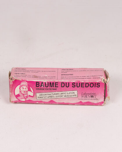 Vintage Baume Du Suedois muscle balm by Laboratoire S. Benoit, complete with its original box. The balm is in tube form, with the box containing details of the product and the manufacturer. The balm itself has a pink and white colour scheme. The cardboard box shows its age with some wear and tear. A unique piece of vintage medical history.