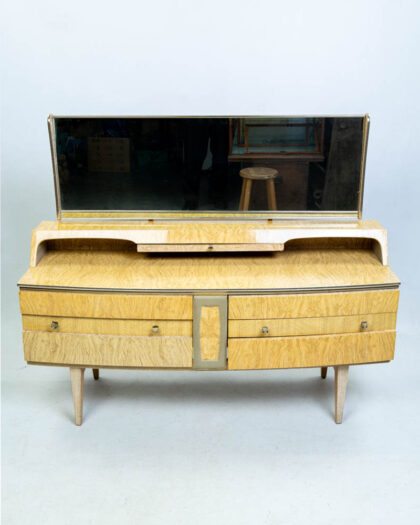 This vintage dressing table features a birdseye maple veneer, known for its distinctive small, swirling "eyes" that create a unique and decorative pattern. The table features a central mirror, framed by brass-coloured trim. The mirror sits above the main surface of the table, offering a clear reflection. The drawer fronts are also decorated with brass-coloured metal trim. The dressing table stands on tapered legs. The piece shows wear commensurate with age. Overall, this dressing table would be a stylish and functional addition to a bedroom, providing a dedicated space for grooming and personal care.
