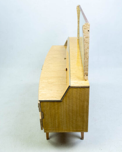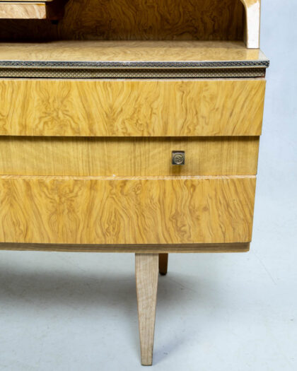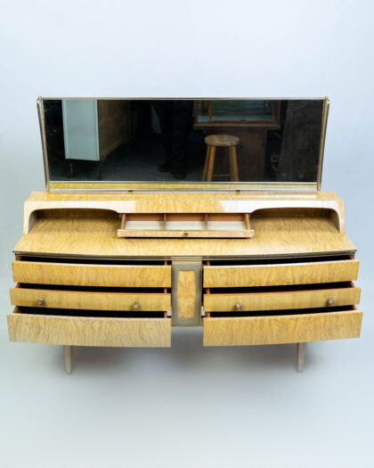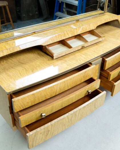 Vintage dressing table featuring birdseye maple veneer with central mirror. Features drawers and brass-coloured metal trim. Some wear visible.
