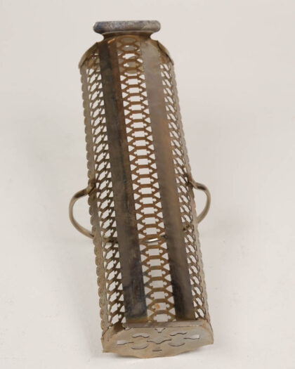This is a vintage biscuit holder. Perfect for adding a little bit of class to your cup of tea! It features a decorative pierced pattern along the sides and ends, with scalloped detailing at each end. The holder also has a simple, arched carrying handle. The metal shows some tarnishing and wear consistent with age. Could be displayed in a dining room or kitchen.