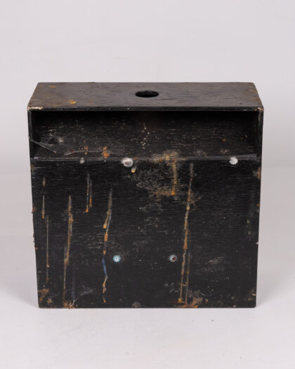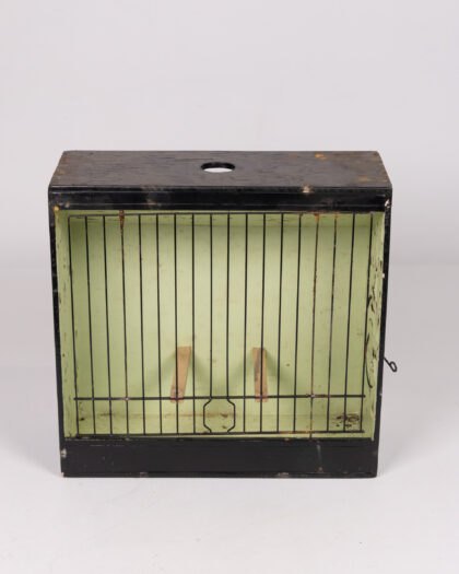 A vintage wooden bird cage. The main colour is black, but the interior is pale green. The cage has metal bars. There are two dowels inside, which likely function as perches. The cage has several areas where the paint is worn or chipped off and there is some residue from what looks like old glue. There is a round lid at the top of the cage with a hole in it, which could be used to hang the cage. On the side, there is a small circular door held shut with metal pins.
