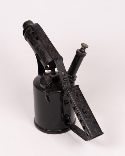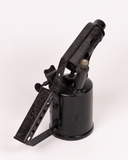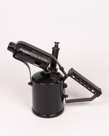 Authentic vintage black metal blow torch, a unique industrial salvage display piece with distinctive design and charming aged patina.